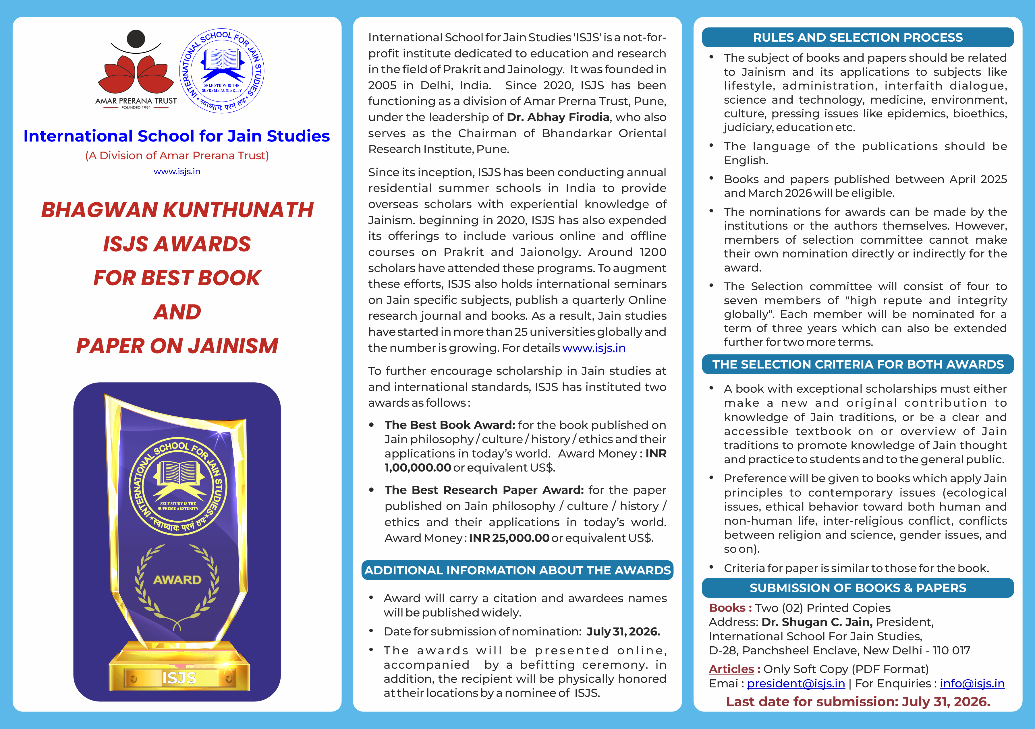 To encourage scholarship in academic studies of Jainism to be of international standards, ISJS proposes to institute Bhagwan Kunthunath award for the best book published.